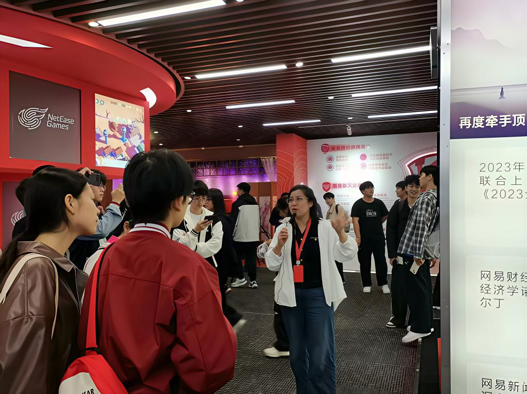 同学们在工作人员的引导下前往园区展厅,沉浸式感受网易深厚的企业文化与创新氛围。网易有道产教融合中心学业就业规划总监李英全程陪同讲解,结合展厅内的技术成果、品牌历程等展示内容,为大家生动解读企业发展理念与行业生态布局。