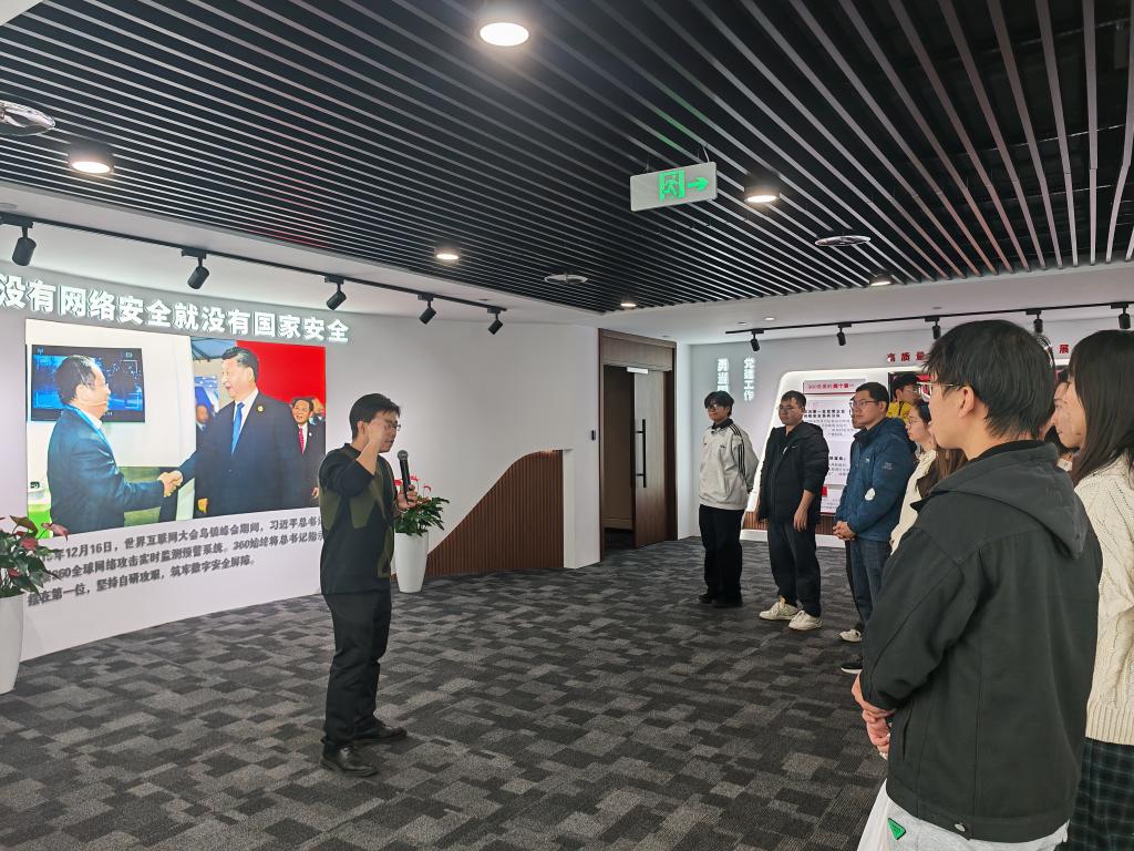 19日下午,参访团前往360数字安全集团进行参观。在360解决方案部高级经理祝建光的引领下,大家深入探究了信息安全竞赛的“实战化”培育路径。在360公司“为人民服务”的主题墙前,师生们手持学院旗帜合影留念。随后,他们在会议室观看了360承办的“全国大学生信息安全竞赛”案例分享。从线上选拔赛到华东、华北赛区的现场角逐,屏幕上选手们专注敲击键盘的身影,让大家真切感受到了竞赛的“实战氛围”。祝经理着重介绍了360承办“天网杯”等全国性技术技能大赛的经验:“信息安全竞赛并非‘纸上谈兵’,而要如同我们开展网络攻防一般,在‘实战环境’中练就真本领”。他进一步阐述道,在“天网杯”的筹备过程中,360投入大量资源搭建了高度仿真的实战网络环境,模拟了各种复杂的网络攻击场景和防御需求,并由网络攻防专家团队为大赛命题。参赛选手们在这样的环境中,需要运用所学知识,迅速准确地识别攻击、分析漏洞,并采取有效的防御措施。这种实战化的竞赛模式,不仅考验了选手们的专业技能,更锻炼了他们在高压环境下的应变能力和团队协作能力。