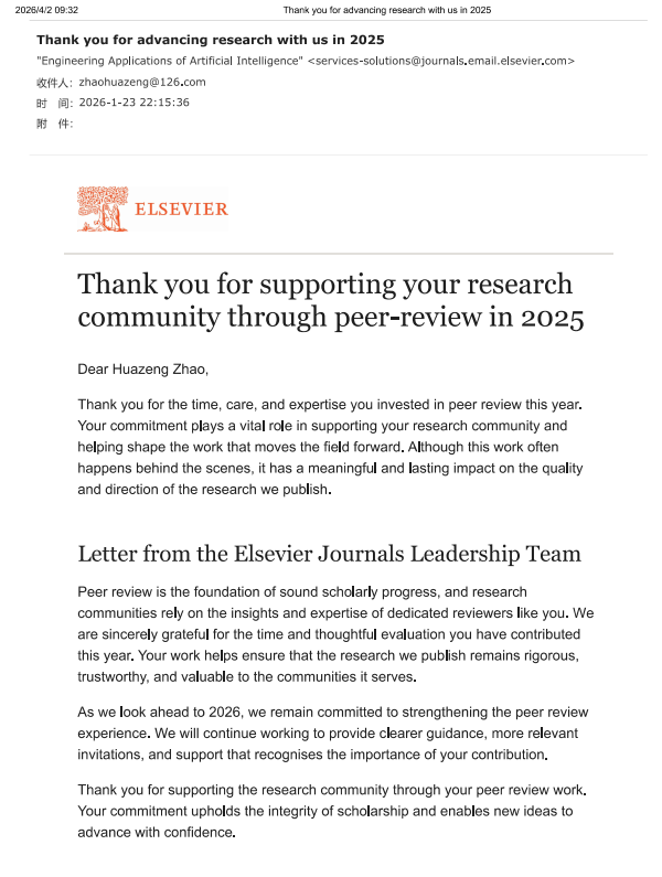 作为爱思唯尔旗下期刊中科院一区TOP期刊《Engineering Applications of Artificial Intelligence》(简称EAAI)的活跃审稿人,赵华增教授在2025年度高质量完成了10余篇稿件的同行评审。感谢信中,爱思唯尔对赵教授严谨、高效、专业的审稿态度给予了高度评价,称其工作为保障期刊学术质量、推动学科发展提供了关键支撑。